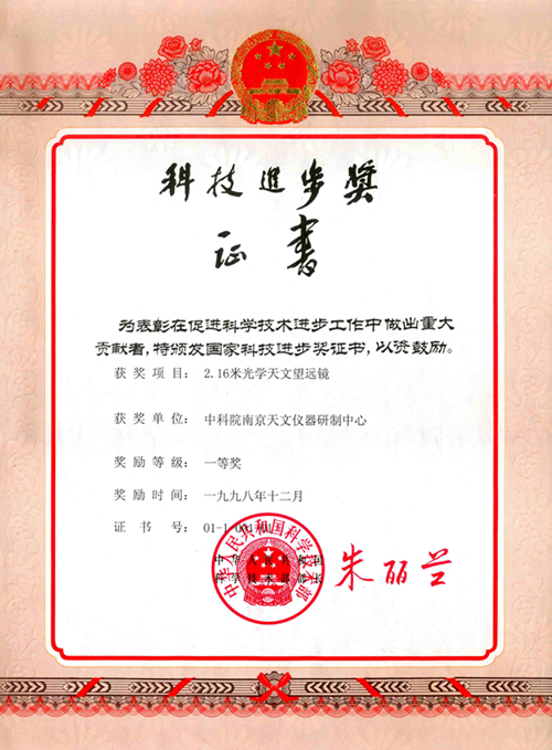 國家科技進步一等獎—2.16米光學天文望遠鏡科技進步獎