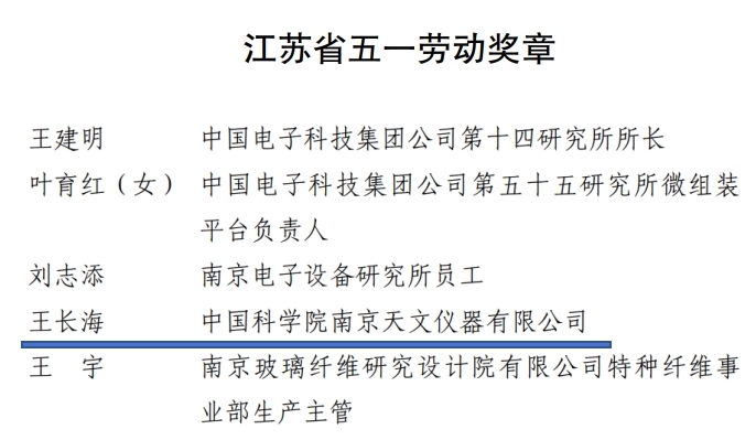 近日,江蘇省總工會、省人力資源和社會保障廳聯合發布表彰決定,中科院南京天文儀器有限公司王長海同志憑借突出的工作業績、精湛的專業技能與無私的奉獻精神,光榮斬獲 “2025年江蘇省五一勞動獎章”,為公司贏得了崇高榮譽!